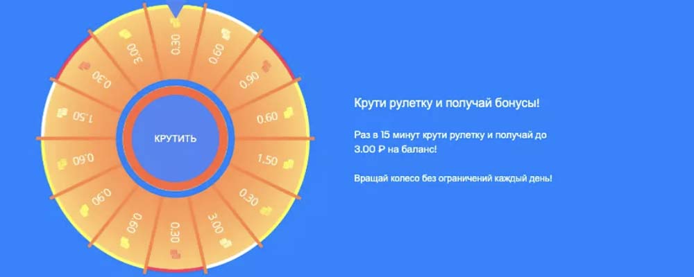 • ежедневный reload – вращение Колеса Фортуны каждые 15 минут с возможностью получения до 3 RUB.